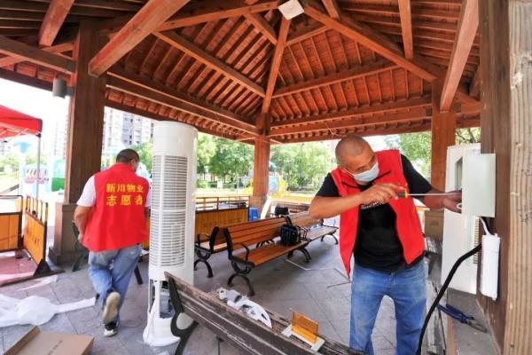 而遮阳棚、一米线、风扇空调、桌椅等装备,更是自愿者们提早支出了大量时候和精神才预备好的。例如,安装空调并不是一件简单的事,但大师仍然在自愿者队伍中找出了“强人”,给排队的居民送上阵阵风凉。