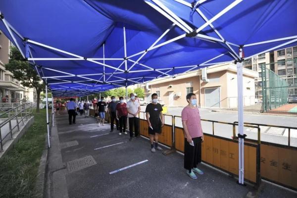 毗连着检测点的,是一条条蓝色“长龙”——为了让排队期待的居民防暑降温,小区特地安装了蓝色遮阳棚,并在部分遮阳棚边设置了空和谐风扇。遮阳棚下还特地划出了一米线,居民们有序排队等待,现场次序井然。