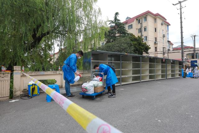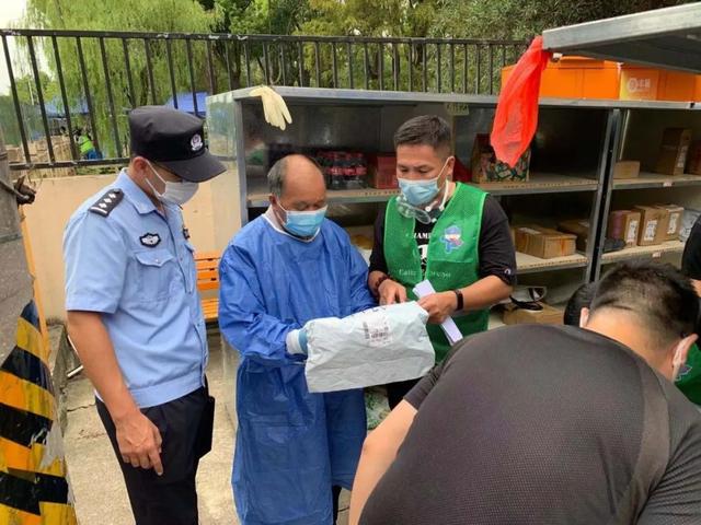 就餐时候到了,小区门口持续不断地送来各类餐食外卖,由专门的自愿者接收并对外卖件停止喷杀消毒,由第二道鉴戒线内的自愿者转送至住户手中。