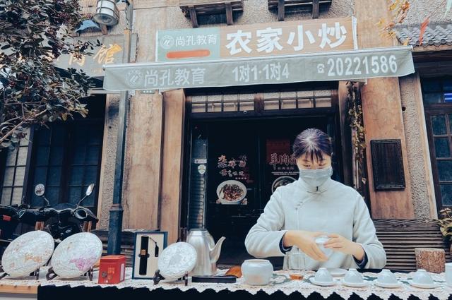 老街内的茶社“弄堂问茶”今年已是第二次加入爱心义卖活动。负责人牟健惟找来了茶艺师现场沏茶,还带来了店内的特点普洱茶。“今年卖的茶品所得,城市捐献给城厢社区,反哺给社区的老百姓,把这份美好延续下去。”他说。