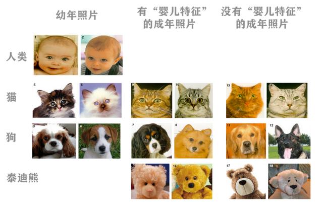 他们把婴儿、猫、狗、泰迪熊的照片组合起来,设想了一个新的关于“婴儿特征”的测试。成果发现人们也会更喜好有“婴儿特征”的猫猫狗狗和泰迪熊,甚至还有物种偏好(狗仆人更喜好小狗脸,猫仆人更喜好小猫脸)。