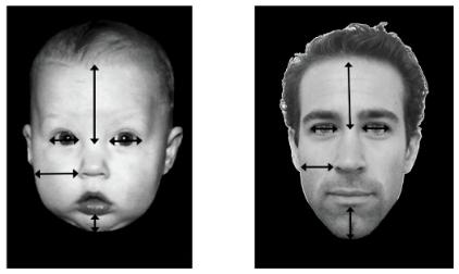 可以比力一下婴儿和大人的脸宽、下巴高度、额头高度、眼宽的明显不同