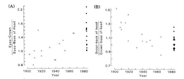 类似的,有研讨者去泰迪熊博物馆,把八十多年间,分歧期间的泰迪熊的面孔做了丈量,发现泰迪熊额头变得越来越高,下巴变得越来越小,这也合适我们刚刚提到的“婴儿特征”。