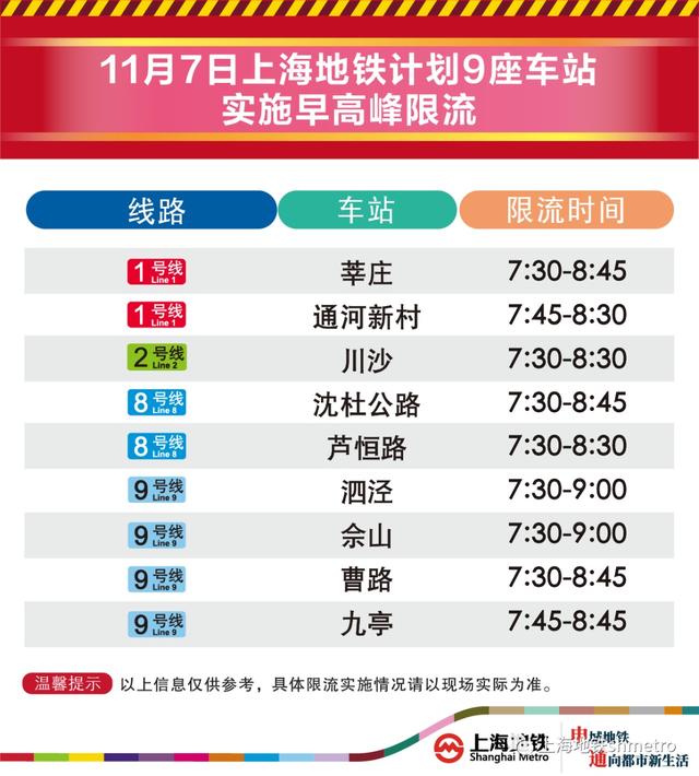 11月7日,上海地铁早高峰限流办法将继续实施,届时将有9座地铁站早高峰计划限流。