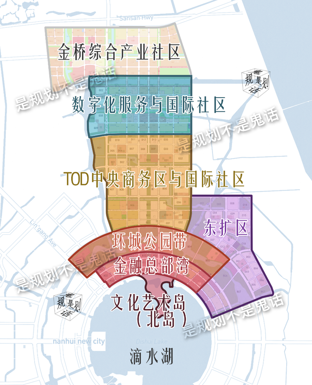 文化艺术岛(北岛)、金融总部湾、东扩区、环城公园带、TOD中心商务区与国际社区(105南)、数字化办事与国际社区(105北),以及北侧紧邻的金桥综合产业社区。