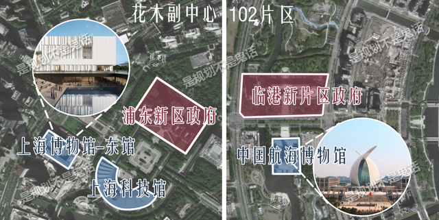 临港新片区政府就位于102片区,而且和花木的格式都一样是:一侧是政府行政中心,另一侧是大型公共文化设备(科技馆、博物馆、图书馆)。