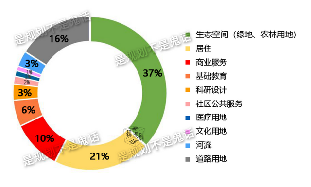 首先要指出,生态资本很是充沛,蓝绿系统交织,地区内计划有37%生态空间(绿地、农林复适用地)和3%的河流水系,占全部地区的40%;同时,各类生活办事都比力完善,有10%的贸易办事、6%的根本教育和2%的社区公共办事用地。