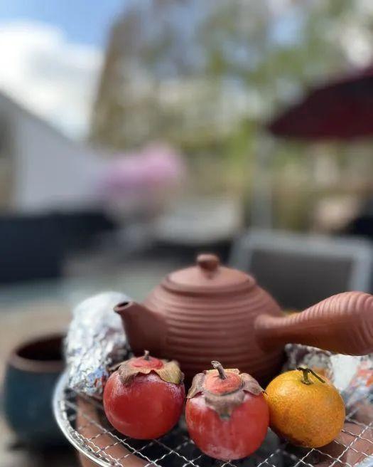 亮点在于围炉煮茶,见与不见美学茶空间供给的烤物很是丰富,地瓜、土豆、芋艿、玉米、橘子、柿子、红枣……每种食材都很新颖,一边在烤炉上噗呲噗呲翻烤食品,一边在红砖搭砌的煮茶台上煮着新茶,别提多舒服了。