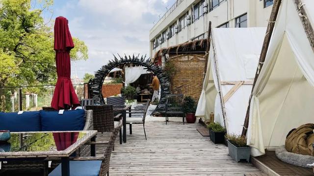 纯红色的外立面被点缀成茅草屋的质朴样子,屋檐下的长条木质案几上摆放着小方桌和藤编蒲团,四周草木环抱,很成心境。还在赞叹于仆人别具匠心打造的小径花园,踏进屋内,已经被老板娘温暖的笑脸所暖和。重头戏还在楼上的屋顶,沿河的好风光搭配三角形露营风帐篷,白石子铺就的小路和竹帘串联起一个个具有私密性的茶空间,空气感实足。