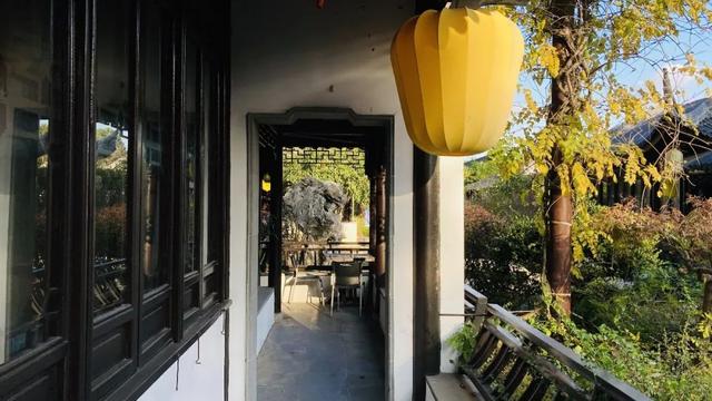 按图索骥来到渔书三到书院时,红色的“渔书书店”的招牌便透出一丝文艺范,而江南园林一般的好风光则藏在一排绿植以后,当你踏进古香古色的宅门以后会有豁然开畅之感。一汪池水出现在眼前,两侧是茂盛的花木、盘曲的回廊、古意盎然的灯笼,氛围间接拉满,更有婀娜的太湖石、游动的鱼群,添了一丝灵动。户外的座位摆放在水池畔和长廊的各个转角之处,很有种苏州园林茶室的悠然感。