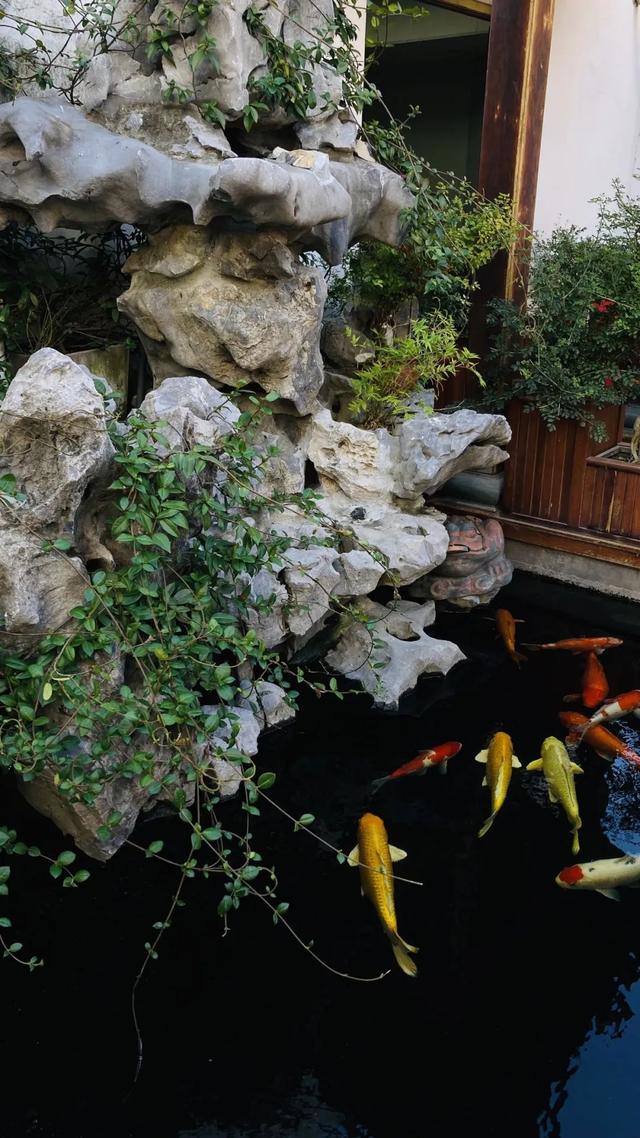 整座宅院白墙黑瓦,飞檐雕花,进入宅院后可见方形水池位于石板路两侧,鲤鱼与倒影相映成趣,宽阔的厅堂被安插成展览空间,以后才是咖啡馆的部分。特别值得一提的是,最初一进院落中打造了一处动物环抱的玻璃房,正合适在绿植中享用一顿阳光brunch。由于对于古宅的庇护性设想,这里还入围了结合国科教文构造亚太地域老修建庇护奖。