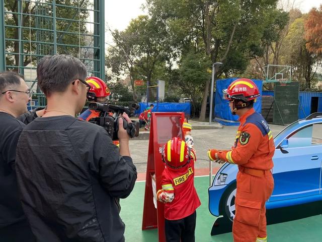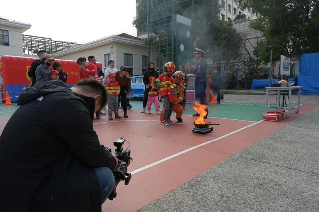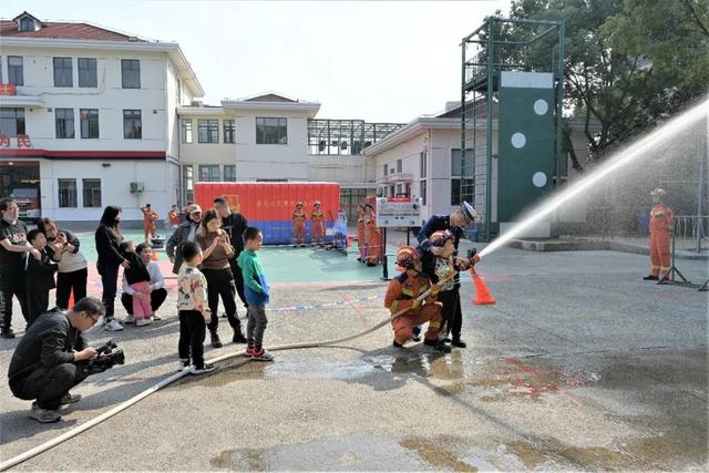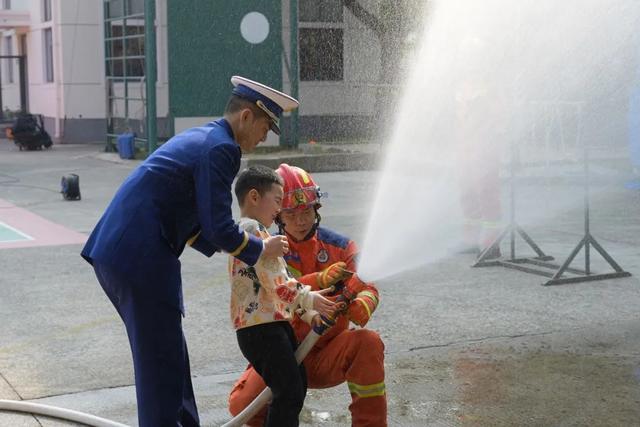 体验环节,孩子们火烧眉毛地穿上消防服、戴上消防帽,在消防员的庇护下上手体验了水枪打靶,看着水柱从一楼打到三楼,再渐渐移动至标定的灭火点,一颗小小的“消防梦”正在抽芽......