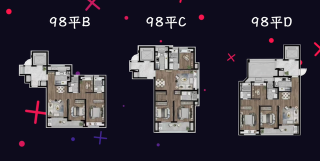榜样房可以看到,89平的户型内,做到了极致三房,狭隘确切狭隘,包括主卧洗手间不带淋浴房,可是总价也确切够香,对于年轻新婚小两口,性价比实足。98平的三房分为三种户型。榜样房只展现了横向的98平户型。