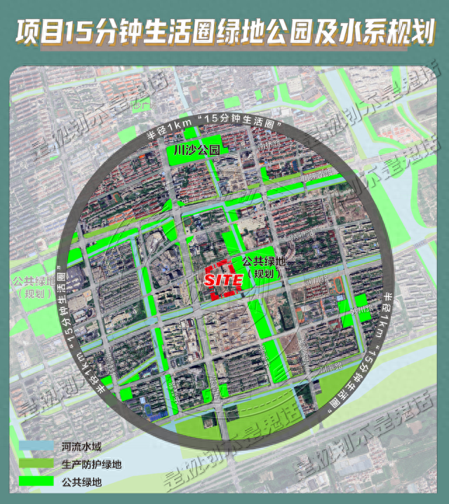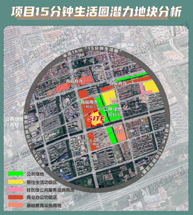 首先,还是以项目为圆心,一千米(成年人步行15分钟)为半径,绘制“15分钟生活圈”。